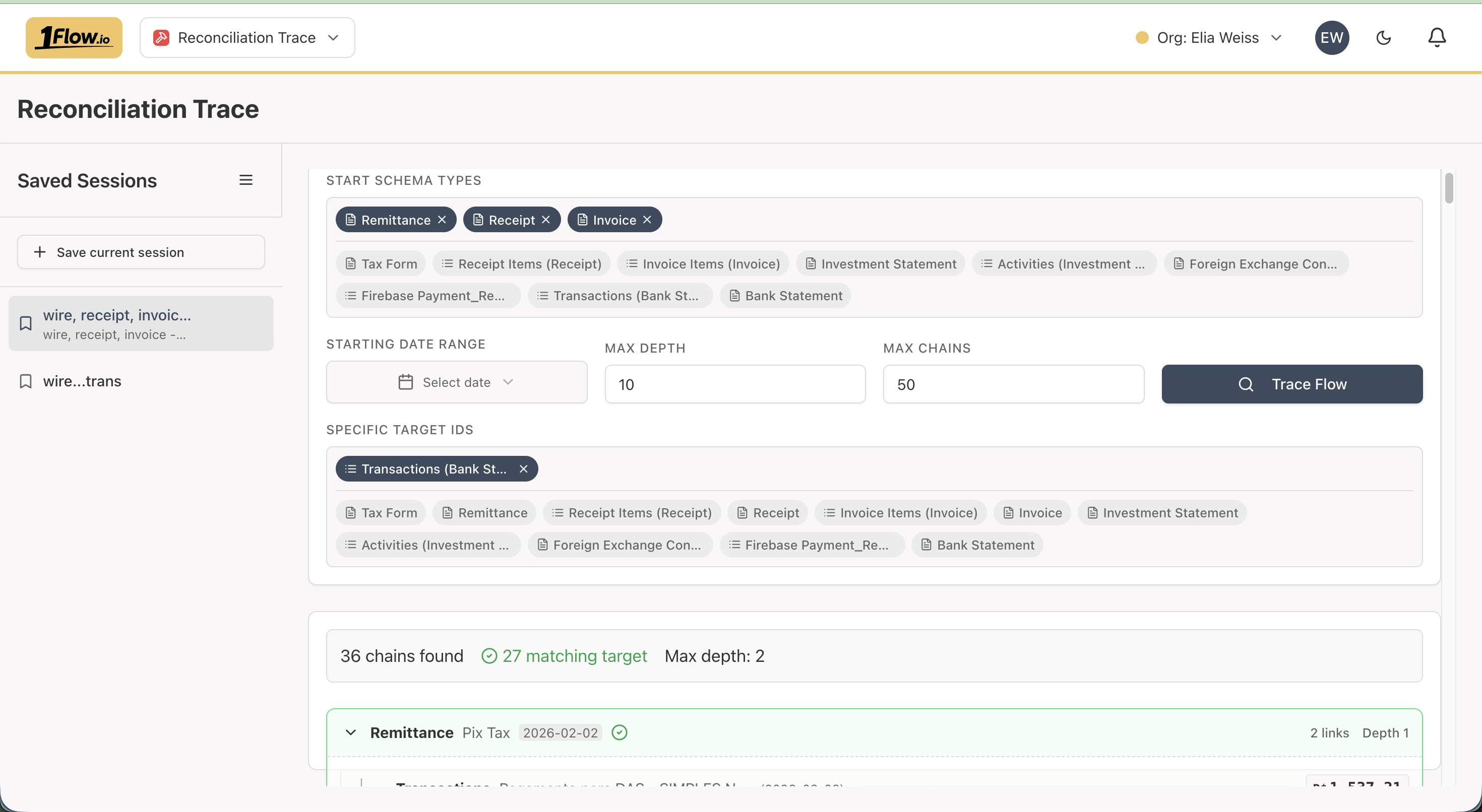 The Money Flow (aka Reconciliation Trace) provides a visual representation of reconciliation relationships, allowing you to trace money flow through your financial data. It displays reconciliation links as a directed graph where you can see how entities are connected and trace paths from source to target entities.